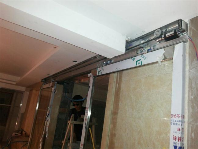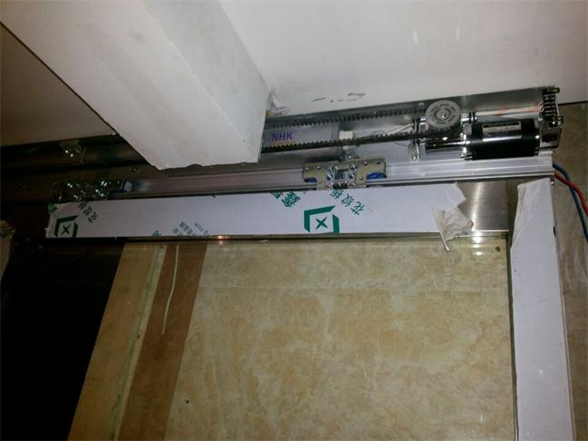 感應探測器探測到有人進入時,感應探測器將收集信號,生成脈沖信號,其后脈沖信號傳給主控器,主控器判斷后通知馬達運行,同時監控馬達轉數,以便通知馬達在一定時候加力和進入慢行運行。馬達得到一定運行電流后做正向運行,將動力傳給同步帶,再由同步帶將動力傳給吊具系統使門扇開啟;門扇開啟后由控制器作出判斷,如需關門,通知馬達作反向運動,關閉門扇。